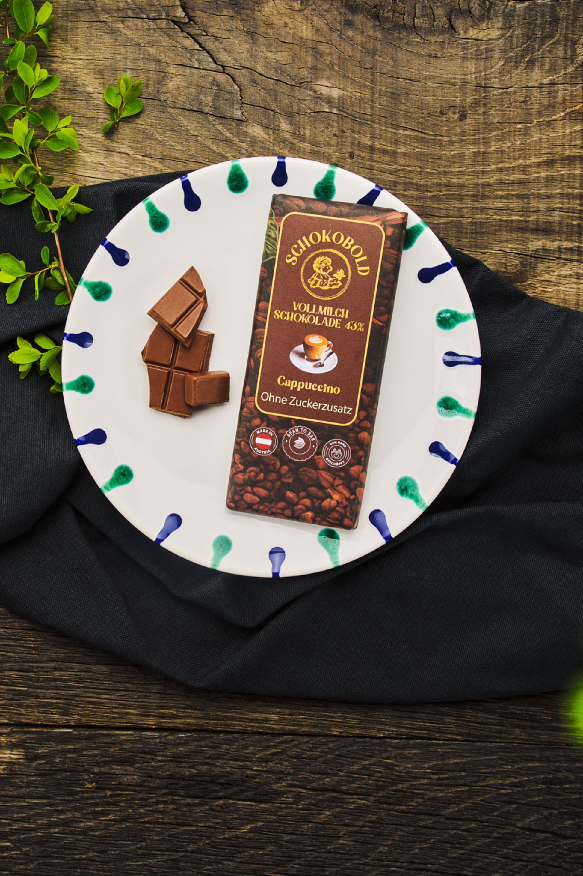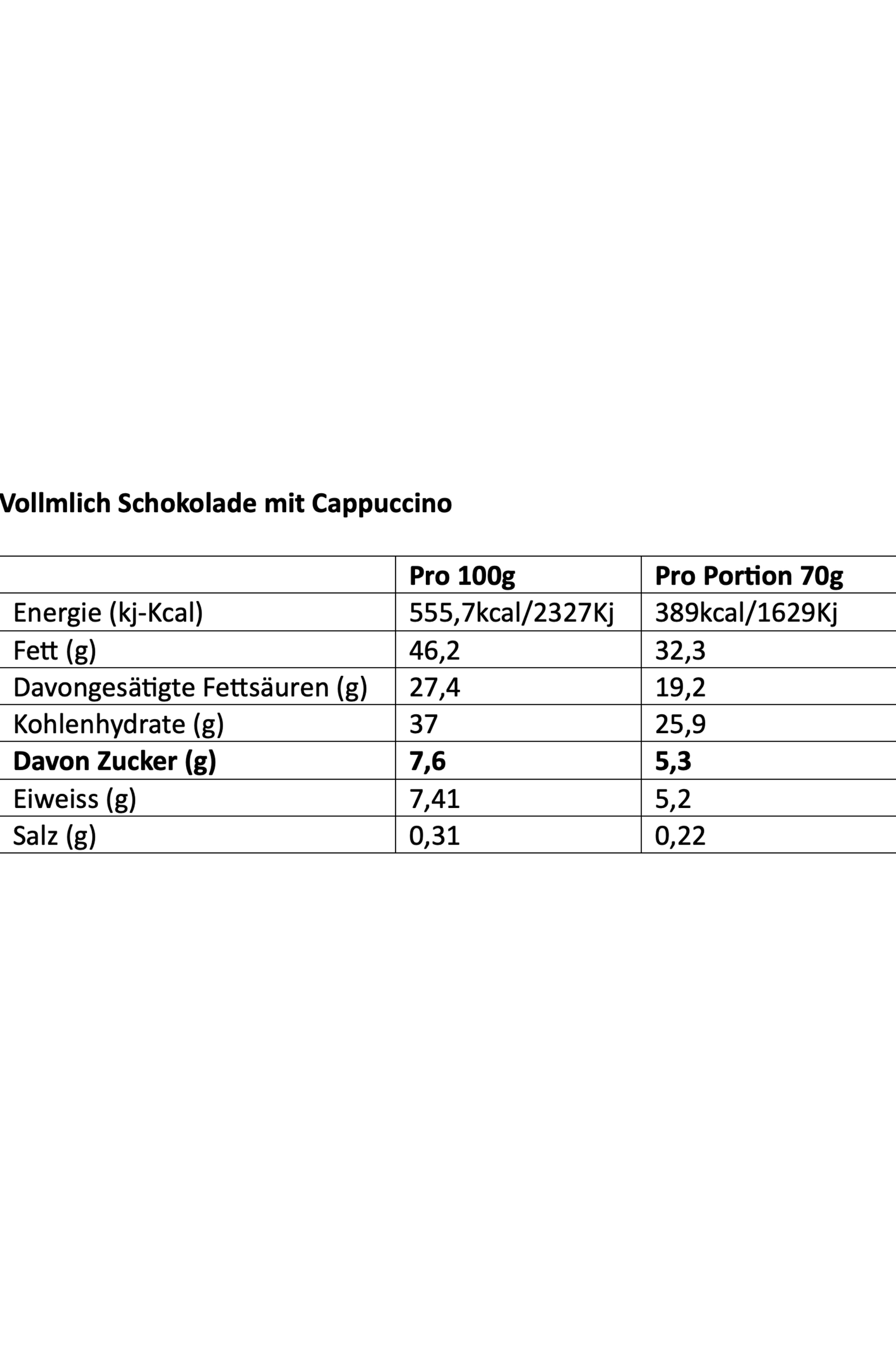 Cappuccino Vollmilchschokolade, ohne Zuckerzusatz. 43% Kakaoanteil. Bean-to-Bar