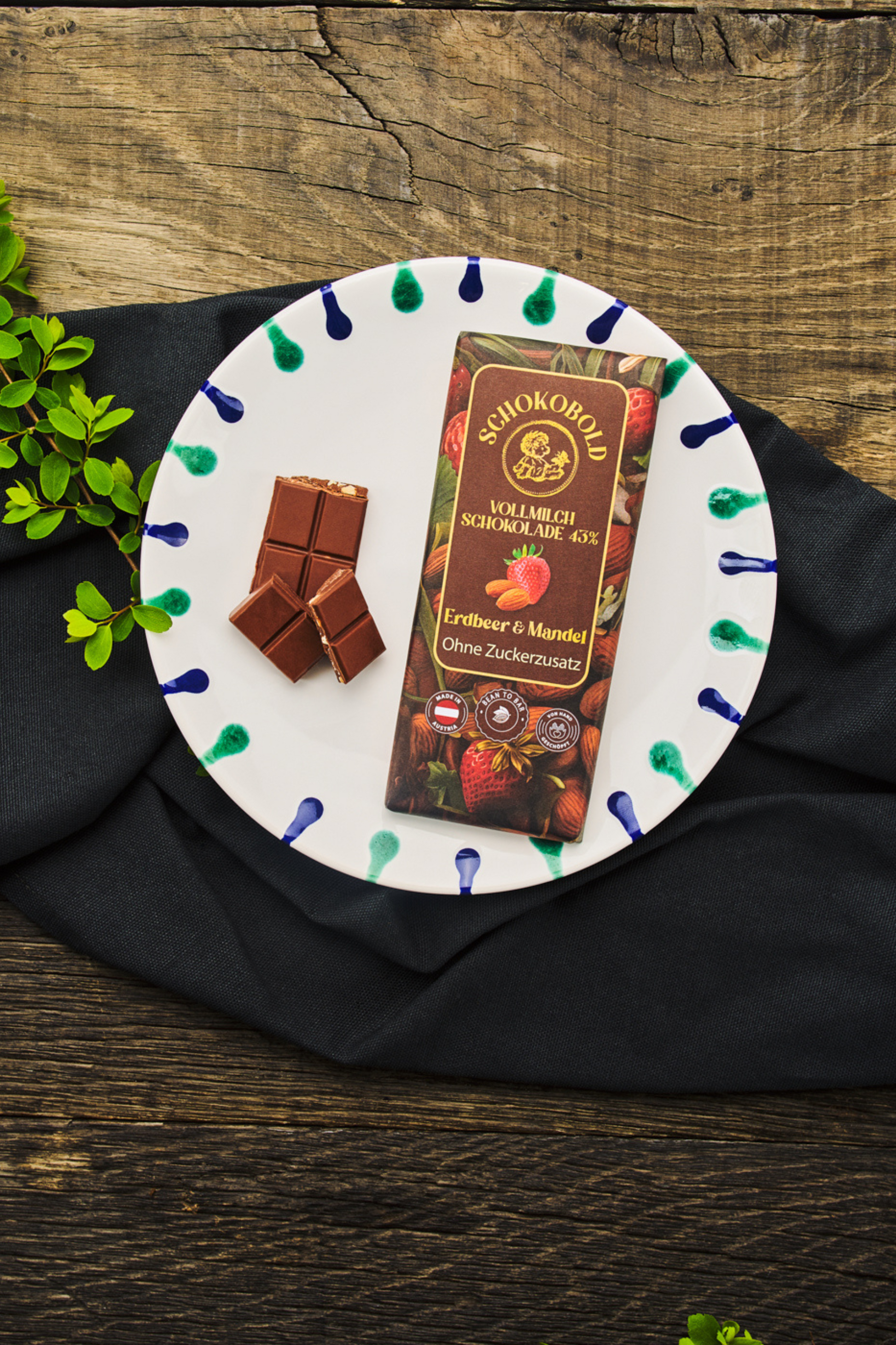 Erdbeer & Mandel Vollmilchschokolade, ohne Zuckerzusatz. 43% Kakaoanteil. Bean-to-Bar