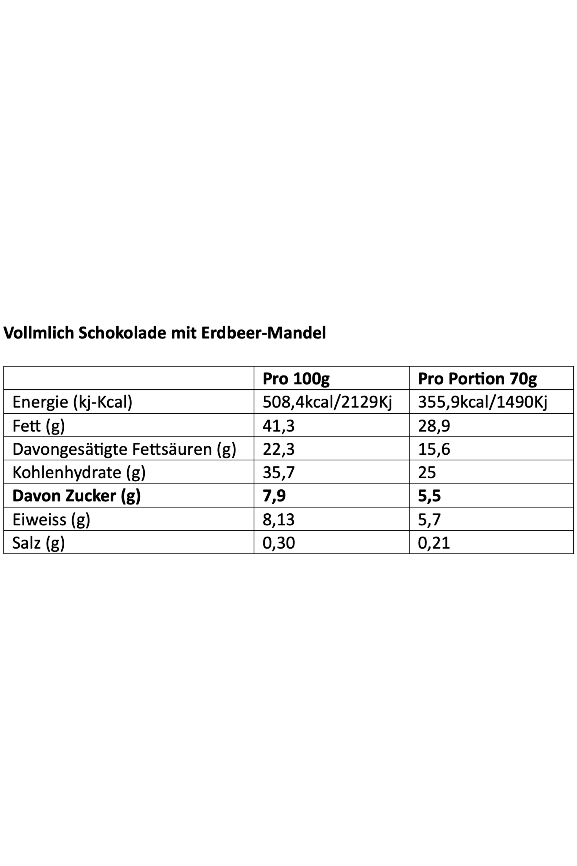 Entdecken Sie die raffinierte Kombination aus zarter Milchschokolade mit 43 % Kakao, saftigen Erdbeeren und knackigen Mandeln – ein Genuss für alle, die Wert auf Geschmack und Qualität legen.