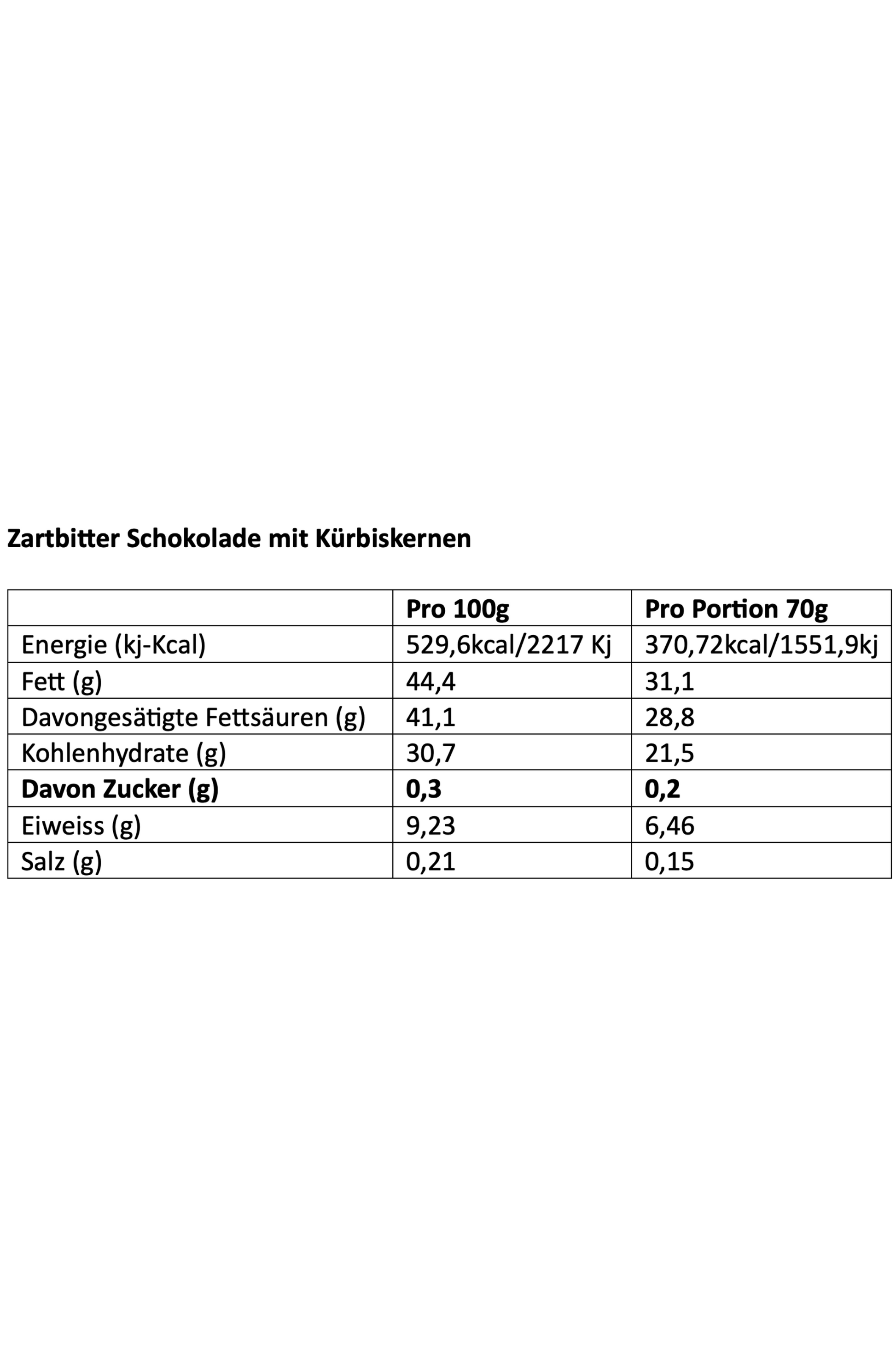 Kürbiskern Zartbitterschokolade, ohne Zuckerzusatz. 70% Kakaoanteil. Vegan. Bean-to-Bar