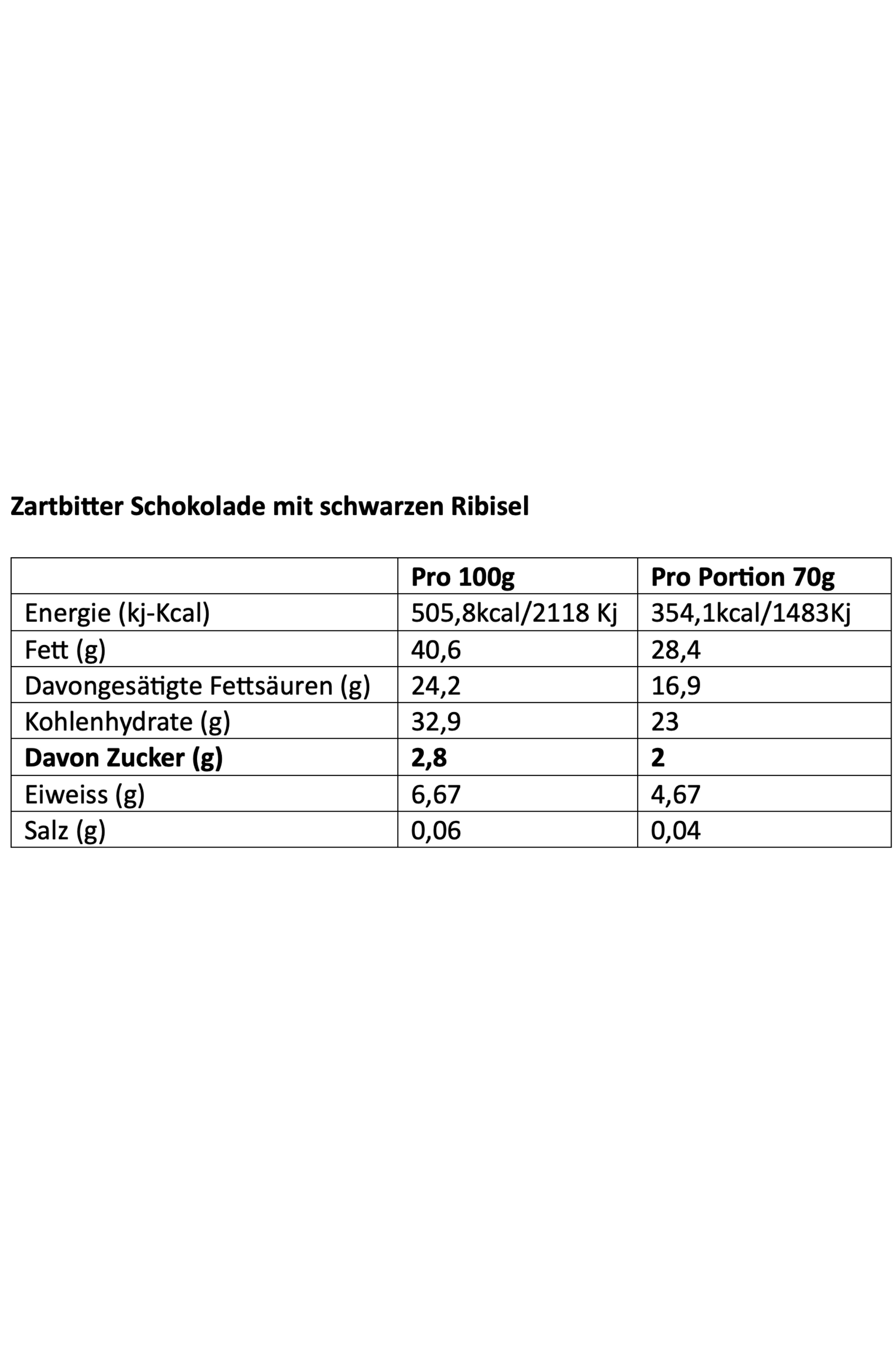 Schwarze Ribisel Zartbitter Schokolade, ohne Zuckerzusatz 70% Kakaoanteil. Vegan. Bean-to-Bar